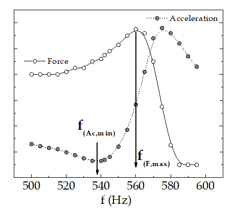 Faire varier régulièrement la fréquence de vibration et observer attentivement les voltmètres qui mesurent la force \((F)\) et l'accélération \((A)\) au voisinage de la fréquence de résonance, la force est maximale et l'accélération est minimale (comme indiqué dans la figure ci-dessus).
