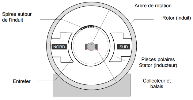 On constate, que s'il est alimenté par un générateur de tension continue, un moteur peut fournir de l'énergie mécanique à un système. Cette énergie mécanique se traduit par l'existence d'un couple de moment r qui peut tourner à la vitesse angulaire \(\omega\).