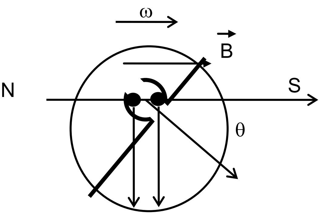 Si on appelle \(\Phi\) le flux maximal passant dans une spire, a` une date t, et si la normale à la spire fait un angle \(\theta=\omega t\) avec l'axe du repère du mouvement (colinéaire au champ magnétique \(\vec{B}\)), le flux \(\varphi\) a pour expression :