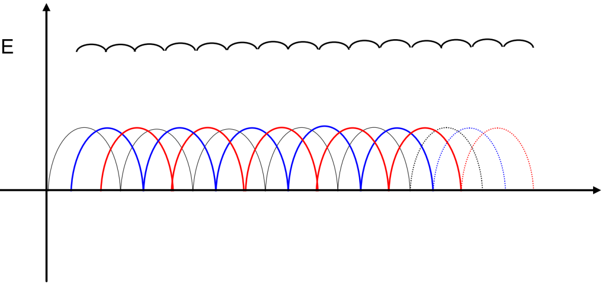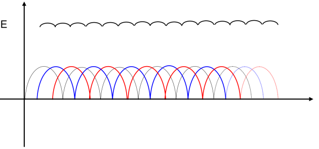 Les tensions dues aux N spires du moteur sont décalées tout autour de l'axe. Elles donnent des tensions qui sont progressivement déphasées les unes par rapport aux autres. Leur somme est une fonction ondulée qui tend à l'être d'autant moins que le nombre de spires et de pôles est plus grand (par exemple, deux paires de pôles ou davantage).