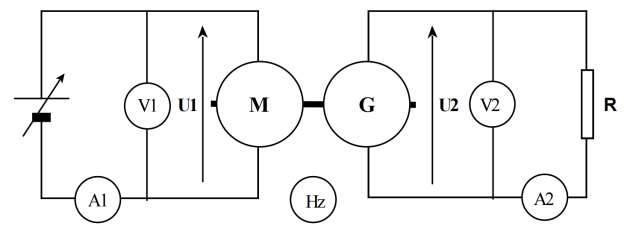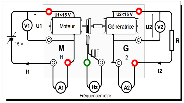 Faire varier progressivement (de 4 Volts à 15 Volts environ) la tension \(U_{1}\) d'alimentation du moteur, et relever les valeurs de la fréquence N de rotation, des tensions \(U_{1}\) et \(U_{2}\) et des intensités \(I_{1}\) et \(I_{2}\).