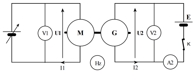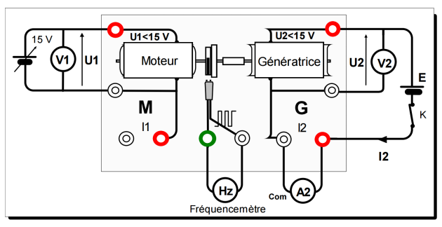 . Deux multimètres sont installés en voltmètres aux bornes du moteur et de la génératrice. Un autre multimètre fonctionne en fréquencemètre et mesure la fréquence de rotation (en Hz). Un 4ème multimètre, utilisé en ampèremètre, mesure l'intensité \(I_{2}\) du courant dans le circuit de la génératrice (on reliera, comme sur le schéma, la borne com sur la borne blanche et l'entrée mA sur la borne rouge de la maquette étudiée).